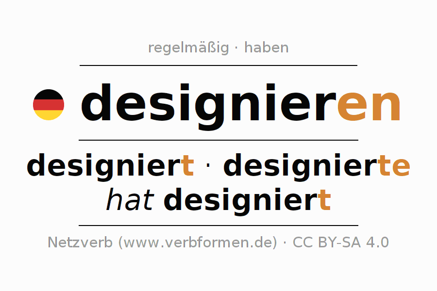 - Perfekt: ich habe designiert, du hast designiert, er hat designiert, wir haben designiert, ihr habt designiert, sie haben designiert