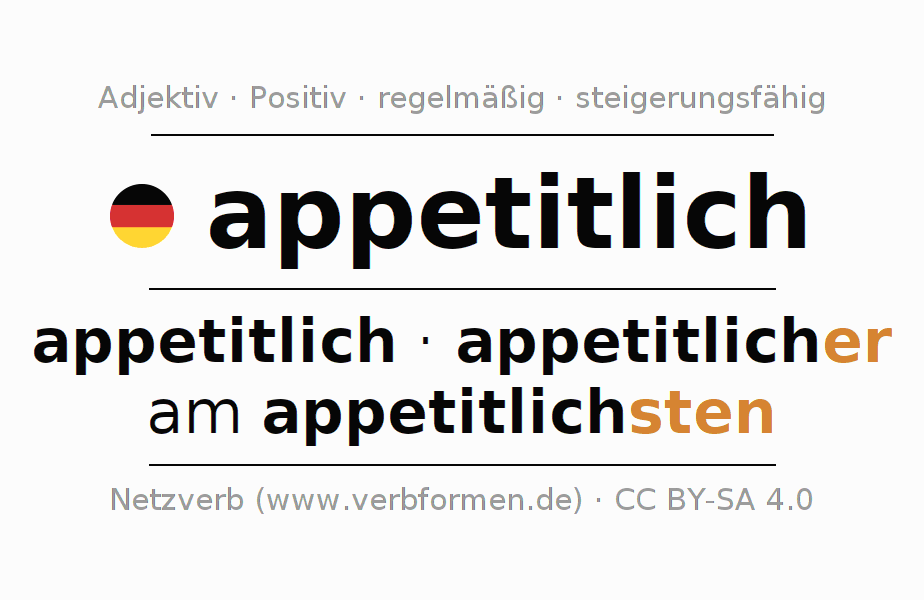 Die Deklination des Adjektivs appetitlich erfolgt über die Komparationsformen appetitlich,appetitlicher,am appetitlichsten. Die Endungen für die Steigerung im Komparativ und Superlativ sind er/sten. Das Adjektiv appetitlich kann sowohl attributiv vor einem Nomen mit und ohne Artikel jeweils stark, schwach und gemischt verwendet werden als auch prädikativ in Verbindung mit einem Verb.Man kann hier nicht nur appetitlich deklinieren und steigern, sondern alle deutschen Adjektive. Kommentare ☆