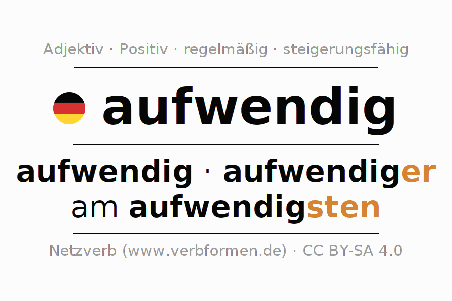 Die Deklination des Adjektivs aufwendig erfolgt über die Komparationsformen aufwendig,aufwendiger,am aufwendigsten. Die Endungen für die Steigerung im Komparativ und Superlativ sind er/sten. Das Adjektiv aufwendig kann sowohl attributiv vor einem Nomen mit und ohne Artikel jeweils stark, schwach und gemischt verwendet werden als auch prädikativ in Verbindung mit einem Verb.Man kann hier nicht nur aufwendig deklinieren und steigern, sondern alle deutschen Adjektive. Kommentare ☆