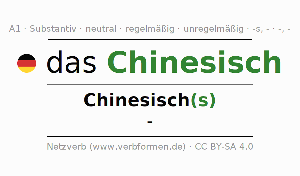 Die Deklination des Substantivs Chinesisch ist im Singular Genitiv Chinesisch(s) und im Plural Nominativ -. Das Nomen Chinesisch wird stark mit den Deklinationsendungen s/-/- dekliniert. Es bildet keine Pluralformen. Das Genus bzw. grammatische Geschlecht von Chinesisch ist Neutral und der bestimmte Artikel ist "das". Man kann hier nicht nur Chinesisch deklinieren, sondern alle deutschen Substantive. Das Substantiv gehört zum Wortschatz des Zertifikats Deutsch bzw. zur Stufe A1. Kommentare ☆