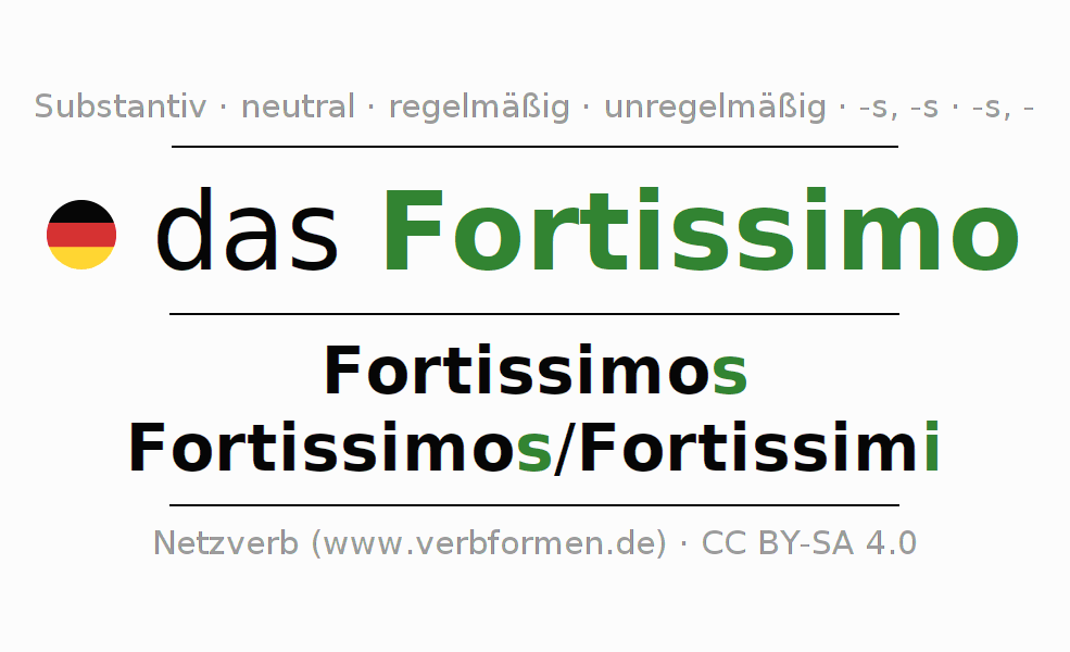 - Singular: das Fortissimo, des Fortissimos, dem Fortissimo, das Fortissimo