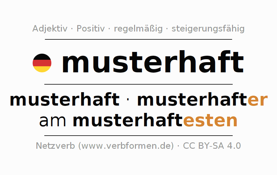 Die Deklination des Adjektivs musterhaft erfolgt über die Komparationsformen musterhaft,musterhafter,am musterhaftesten. Die Endungen für die Steigerung im Komparativ und Superlativ sind er/esten. Das Adjektiv musterhaft kann sowohl attributiv vor einem Nomen mit und ohne Artikel jeweils stark, schwach und gemischt verwendet werden als auch prädikativ in Verbindung mit einem Verb.Man kann hier nicht nur musterhaft deklinieren und steigern, sondern alle deutschen Adjektive. Kommentare ☆