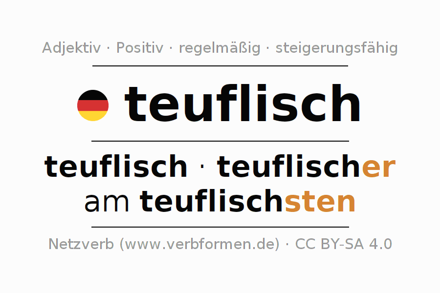 Die Deklination des Adjektivs teuflisch erfolgt über die Komparationsformen teuflisch,teuflischer,am teuflischsten. Die Endungen für die Steigerung im Komparativ und Superlativ sind er/sten. Das Adjektiv teuflisch kann sowohl attributiv vor einem Nomen mit und ohne Artikel jeweils stark, schwach und gemischt verwendet werden als auch prädikativ in Verbindung mit einem Verb.Man kann hier nicht nur teuflisch deklinieren und steigern, sondern alle deutschen Adjektive. Kommentare ☆