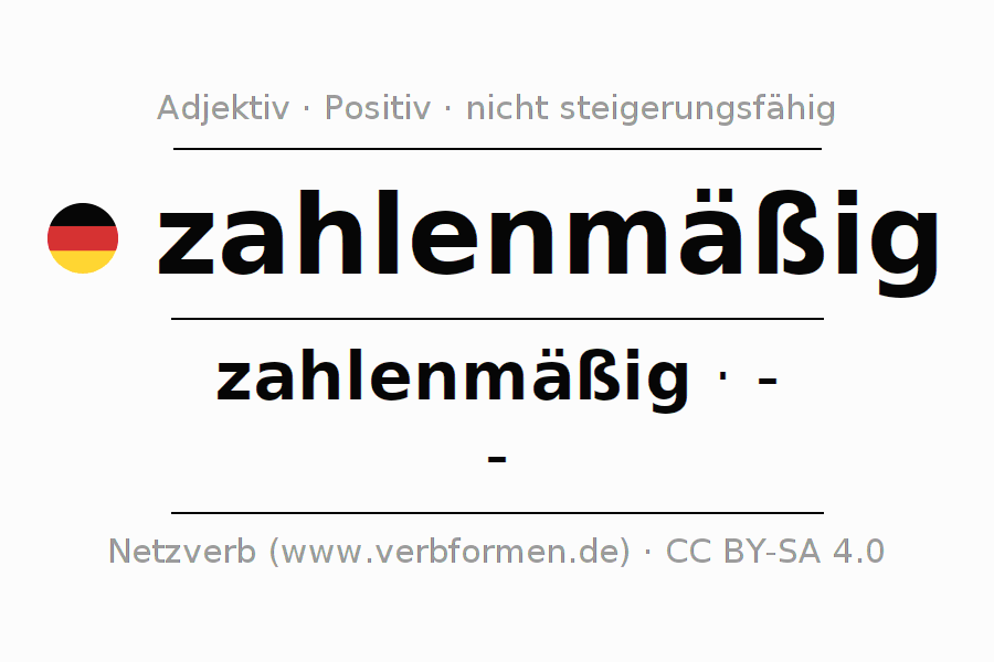 Die zahlenmäßig Deklination und Steigerung online als Deklinations- und Komparationstabellen mit allen starken, schwachen und gemischten Formen. Diese werden übersichtlich als Tabelle im Singular (Einzahl) und im Plural (Mehrzahl) und in allen vier Fällen Nominativ (auch 1. Fall, Wer-Fall), Genitiv (auch 2. Fall, Wes-Fall, Wessen-Fall), Dativ (auch 3. Fall, Wem-Fall) und Akkusativ (auch 4. Fall, Wen-Fall) dargestellt. Weitere Informationen finden sich unter Wiktionary zahlenmäßig und unter zahlenmäßig im Duden.