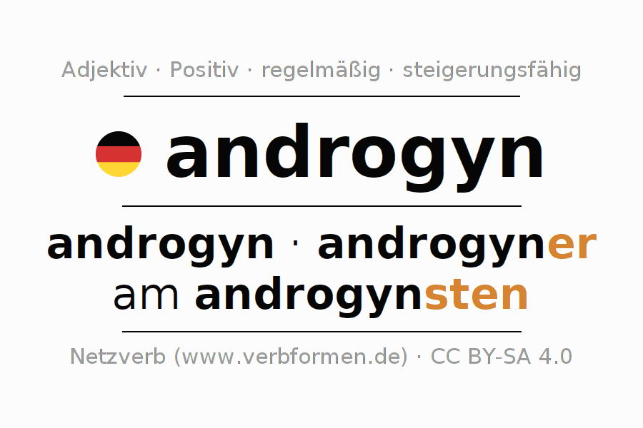Die Deklination des Adjektivs androgyn erfolgt über die Komparationsformen androgyn,androgyner,am androgynsten. Die Endungen für die Steigerung im Komparativ und Superlativ sind er/sten. Das Adjektiv androgyn kann sowohl attributiv vor einem Nomen mit und ohne Artikel jeweils stark, schwach und gemischt verwendet werden als auch prädikativ in Verbindung mit einem Verb.Man kann hier nicht nur androgyn deklinieren und steigern, sondern alle deutschen Adjektive. Kommentare ☆