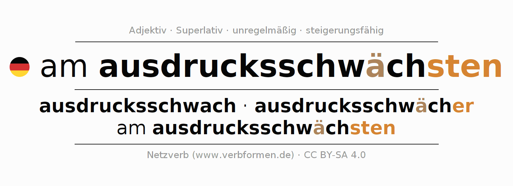Die Deklination des Adjektivs am ausdrucksschwächsten erfolgt über die Komparationsformen ausdrucksschwach,ausdrucksschwächer,am ausdrucksschwächsten. Die Endungen für die Steigerung im Komparativ und Superlativ sind ä-er/ä-sten. Das Adjektiv am ausdrucksschwächsten kann sowohl attributiv vor einem Nomen mit und ohne Artikel jeweils stark, schwach und gemischt verwendet werden als auch prädikativ in Verbindung mit einem Verb.Man kann hier nicht nur am ausdrucksschwächsten deklinieren und steigern, sondern alle deutschen Adjektive. Kommentare ☆