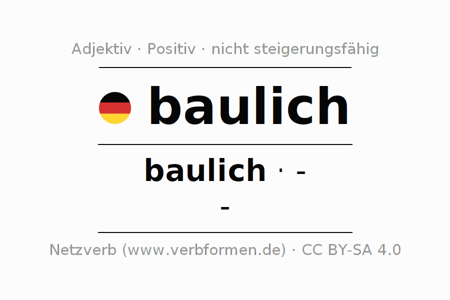 Die baulich Deklination und Steigerung online als Deklinations- und Komparationstabellen mit allen starken, schwachen und gemischten Formen. Diese werden übersichtlich als Tabelle im Singular (Einzahl) und im Plural (Mehrzahl) und in allen vier Fällen Nominativ (auch 1. Fall, Wer-Fall), Genitiv (auch 2. Fall, Wes-Fall, Wessen-Fall), Dativ (auch 3. Fall, Wem-Fall) und Akkusativ (auch 4. Fall, Wen-Fall) dargestellt. Weitere Informationen finden sich unter Wiktionary baulich und unter baulich im Duden.
