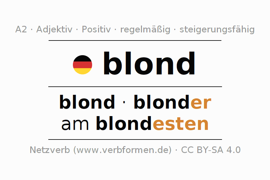 Die Deklination des Adjektivs blond erfolgt über die Komparationsformen blond,blonder,am blondesten. Die Endungen für die Steigerung im Komparativ und Superlativ sind er/esten. Das Adjektiv blond kann sowohl attributiv vor einem Nomen mit und ohne Artikel jeweils stark, schwach und gemischt verwendet werden als auch prädikativ in Verbindung mit einem Verb.Man kann hier nicht nur blond deklinieren und steigern, sondern alle deutschen Adjektive. Kommentare ☆