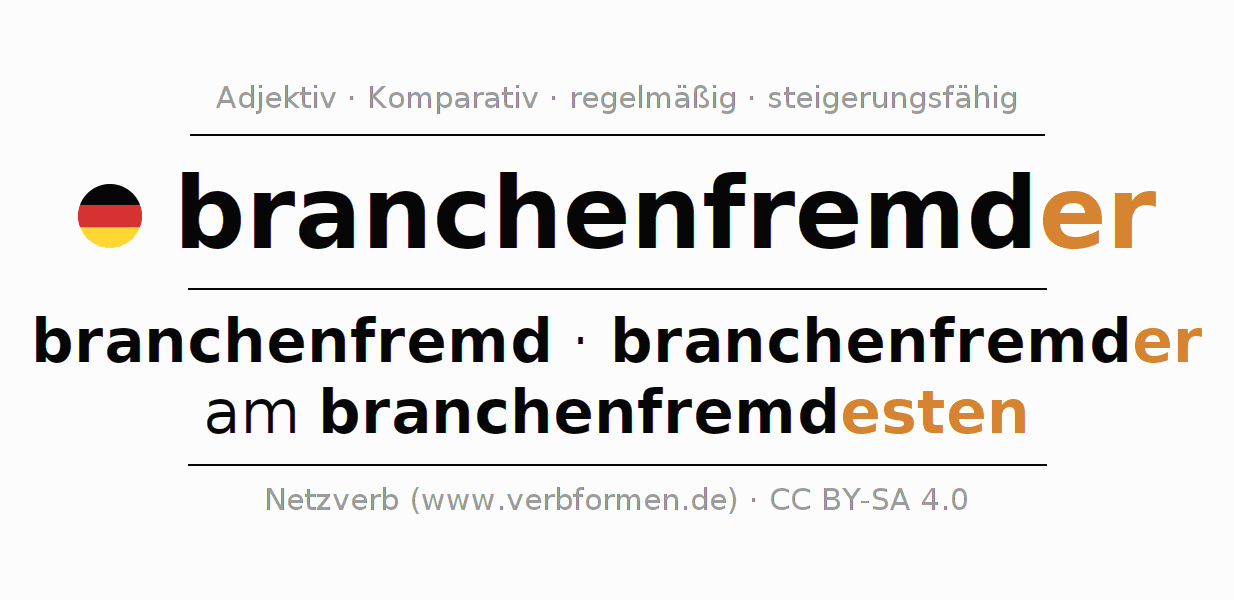 Die branchenfremder Deklination und Steigerung online als Deklinations- und Komparationstabellen mit allen starken, schwachen und gemischten Formen. Diese werden übersichtlich als Tabelle im Singular (Einzahl) und im Plural (Mehrzahl) und in allen vier Fällen Nominativ (auch 1. Fall, Wer-Fall), Genitiv (auch 2. Fall, Wes-Fall, Wessen-Fall), Dativ (auch 3. Fall, Wem-Fall) und Akkusativ (auch 4. Fall, Wen-Fall) dargestellt. Weitere Informationen finden sich unter Wiktionary branchenfremder und unter branchenfremder im Duden.