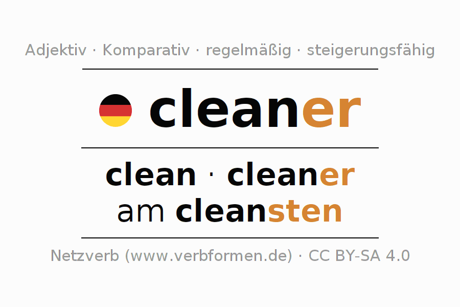 Die Deklination des Adjektivs cleaner erfolgt über die Komparationsformen clean,cleaner,am cleansten. Die Endungen für die Steigerung im Komparativ und Superlativ sind er/sten. Das Adjektiv cleaner kann sowohl attributiv vor einem Nomen mit und ohne Artikel jeweils stark, schwach und gemischt verwendet werden als auch prädikativ in Verbindung mit einem Verb.Man kann hier nicht nur cleaner deklinieren und steigern, sondern alle deutschen Adjektive. Kommentare ☆