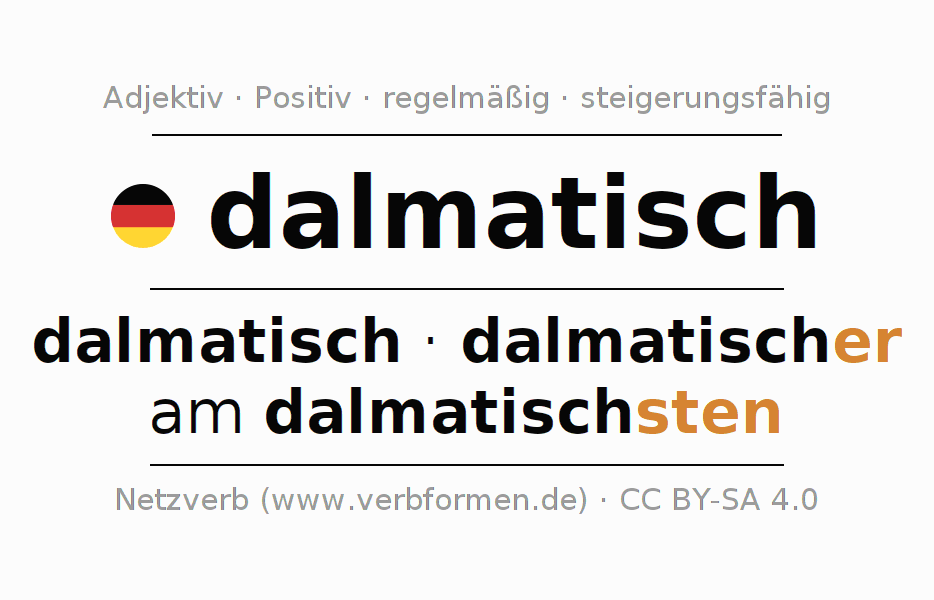 Die Deklination des Adjektivs dalmatisch erfolgt über die Komparationsformen dalmatisch,dalmatischer,am dalmatischsten. Die Endungen für die Steigerung im Komparativ und Superlativ sind er/sten. Das Adjektiv dalmatisch kann sowohl attributiv vor einem Nomen mit und ohne Artikel jeweils stark, schwach und gemischt verwendet werden als auch prädikativ in Verbindung mit einem Verb.Man kann hier nicht nur dalmatisch deklinieren und steigern, sondern alle deutschen Adjektive. Kommentare ☆