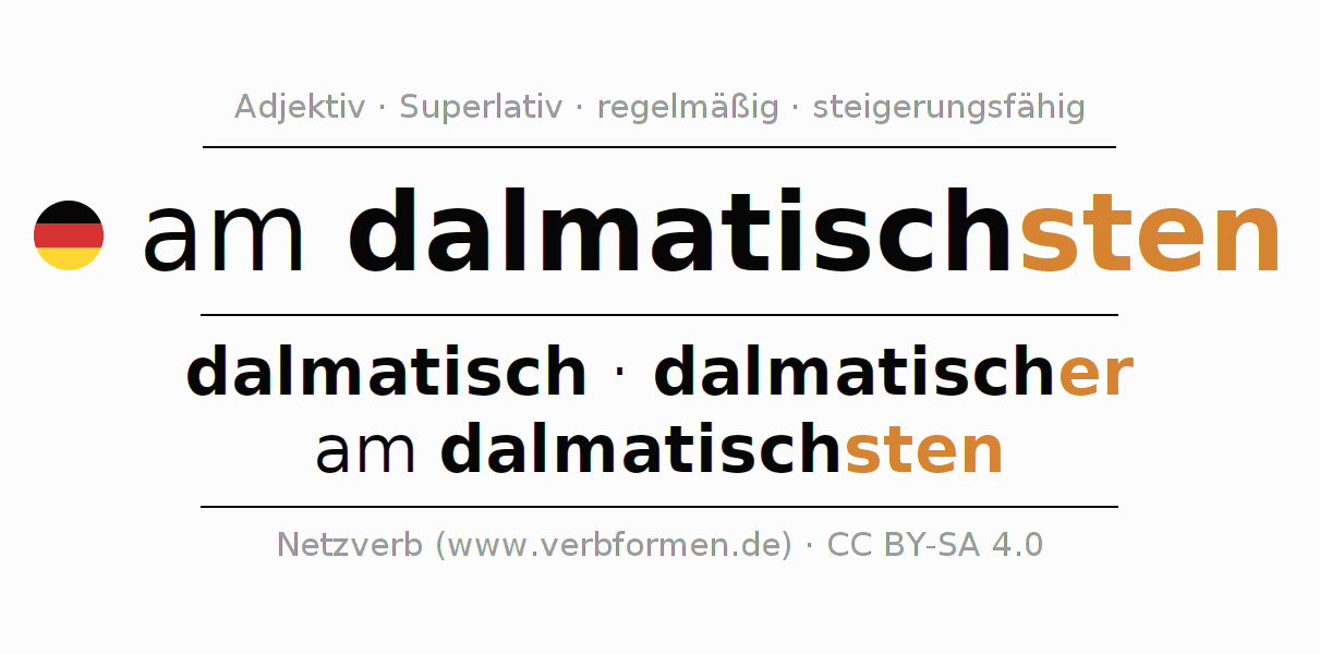 Die am dalmatischsten Deklination und Steigerung online als Deklinations- und Komparationstabellen mit allen starken, schwachen und gemischten Formen. Diese werden übersichtlich als Tabelle im Singular (Einzahl) und im Plural (Mehrzahl) und in allen vier Fällen Nominativ (auch 1. Fall, Wer-Fall), Genitiv (auch 2. Fall, Wes-Fall, Wessen-Fall), Dativ (auch 3. Fall, Wem-Fall) und Akkusativ (auch 4. Fall, Wen-Fall) dargestellt. Weitere Informationen finden sich unter Wiktionary am dalmatischsten und unter am dalmatischsten im Duden.