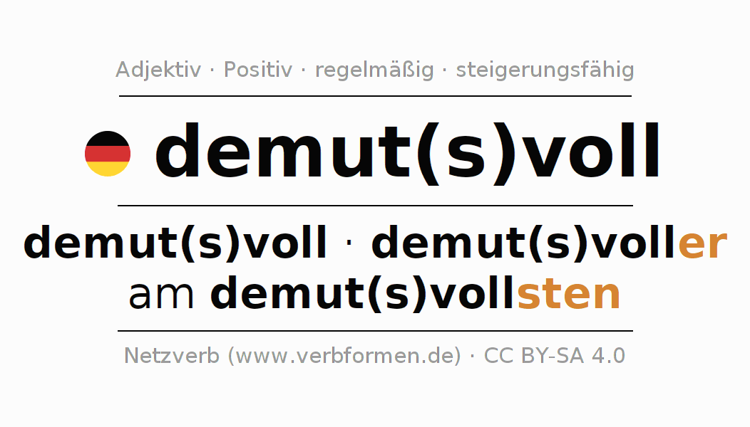 Die demutsvoll Deklination und Steigerung online als Deklinations- und Komparationstabellen mit allen starken, schwachen und gemischten Formen. Diese werden übersichtlich als Tabelle im Singular (Einzahl) und im Plural (Mehrzahl) und in allen vier Fällen Nominativ (auch 1. Fall, Wer-Fall), Genitiv (auch 2. Fall, Wes-Fall, Wessen-Fall), Dativ (auch 3. Fall, Wem-Fall) und Akkusativ (auch 4. Fall, Wen-Fall) dargestellt. Weitere Informationen finden sich unter Wiktionary demutsvoll und unter demutsvoll im Duden.