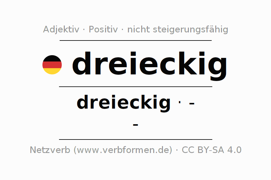 Die Deklination des Adjektivs dreieckig erfolgt über die nicht steigerbare Form dreieckig. Das Adjektiv besitzt keine Formen für den Komparativ und Superlativ. Das Adjektiv dreieckig kann sowohl attributiv vor einem Nomen mit und ohne Artikel jeweils stark, schwach und gemischt verwendet werden als auch prädikativ in Verbindung mit einem Verb.Man kann hier nicht nur dreieckig deklinieren und steigern, sondern alle deutschen Adjektive. Kommentare ☆