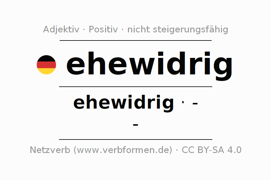 Die ehewidrig Deklination und Steigerung online als Deklinations- und Komparationstabellen mit allen starken, schwachen und gemischten Formen. Diese werden übersichtlich als Tabelle im Singular (Einzahl) und im Plural (Mehrzahl) und in allen vier Fällen Nominativ (auch 1. Fall, Wer-Fall), Genitiv (auch 2. Fall, Wes-Fall, Wessen-Fall), Dativ (auch 3. Fall, Wem-Fall) und Akkusativ (auch 4. Fall, Wen-Fall) dargestellt. Weitere Informationen finden sich unter Wiktionary ehewidrig und unter ehewidrig im Duden.