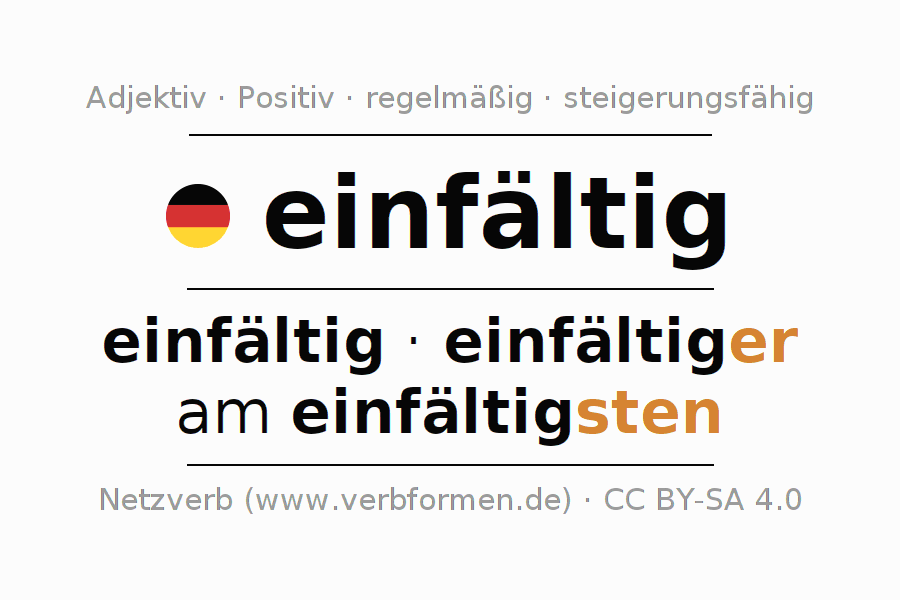 Die Deklination des Adjektivs einfältig erfolgt über die Komparationsformen einfältig,einfältiger,am einfältigsten. Die Endungen für die Steigerung im Komparativ und Superlativ sind er/sten. Das Adjektiv einfältig kann sowohl attributiv vor einem Nomen mit und ohne Artikel jeweils stark, schwach und gemischt verwendet werden als auch prädikativ in Verbindung mit einem Verb.Man kann hier nicht nur einfältig deklinieren und steigern, sondern alle deutschen Adjektive. Kommentare ☆