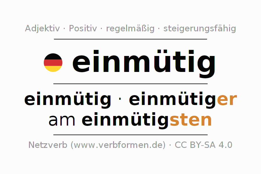 Die Deklination des Adjektivs einmütig erfolgt über die Komparationsformen einmütig,einmütiger,am einmütigsten. Die Endungen für die Steigerung im Komparativ und Superlativ sind er/sten. Das Adjektiv einmütig kann sowohl attributiv vor einem Nomen mit und ohne Artikel jeweils stark, schwach und gemischt verwendet werden als auch prädikativ in Verbindung mit einem Verb.Man kann hier nicht nur einmütig deklinieren und steigern, sondern alle deutschen Adjektive. Kommentare ☆