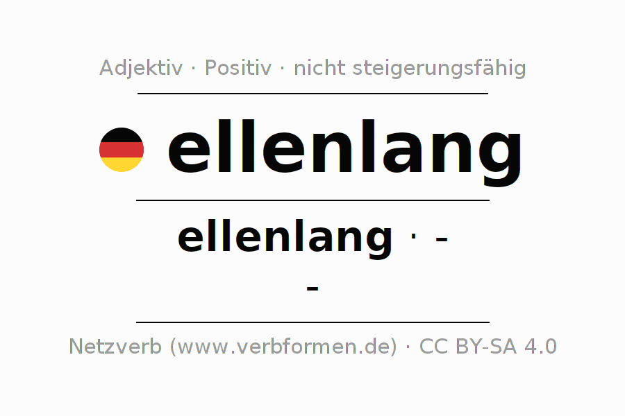 Die ellenlang Deklination und Steigerung online als Deklinations- und Komparationstabellen mit allen starken, schwachen und gemischten Formen. Diese werden übersichtlich als Tabelle im Singular (Einzahl) und im Plural (Mehrzahl) und in allen vier Fällen Nominativ (auch 1. Fall, Wer-Fall), Genitiv (auch 2. Fall, Wes-Fall, Wessen-Fall), Dativ (auch 3. Fall, Wem-Fall) und Akkusativ (auch 4. Fall, Wen-Fall) dargestellt. Weitere Informationen finden sich unter Wiktionary ellenlang und unter ellenlang im Duden.