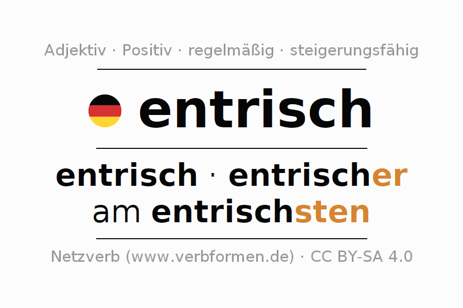Die Deklination des Adjektivs entrisch erfolgt über die Komparationsformen entrisch,entrischer,am entrischsten. Die Endungen für die Steigerung im Komparativ und Superlativ sind er/sten. Das Adjektiv entrisch kann sowohl attributiv vor einem Nomen mit und ohne Artikel jeweils stark, schwach und gemischt verwendet werden als auch prädikativ in Verbindung mit einem Verb.Man kann hier nicht nur entrisch deklinieren und steigern, sondern alle deutschen Adjektive. Kommentare ☆