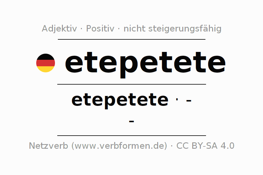 Die Deklination des Adjektivs etepetete erfolgt über die nicht steigerbare Form etepetete. Das Adjektiv besitzt keine Formen für den Komparativ und Superlativ. Das Adjektiv etepetete kann sowohl attributiv vor einem Nomen mit und ohne Artikel jeweils stark, schwach und gemischt verwendet werden als auch prädikativ in Verbindung mit einem Verb.Man kann hier nicht nur etepetete deklinieren und steigern, sondern alle deutschen Adjektive. Kommentare ☆