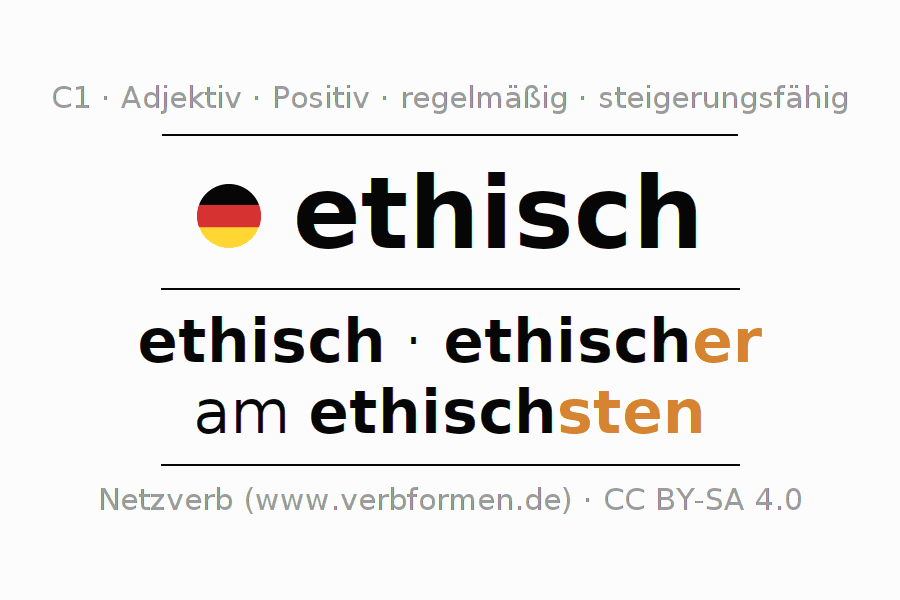 Die Deklination des Adjektivs ethisch erfolgt über die Komparationsformen ethisch,ethischer,am ethischsten. Die Endungen für die Steigerung im Komparativ und Superlativ sind er/sten. Das Adjektiv ethisch kann sowohl attributiv vor einem Nomen mit und ohne Artikel jeweils stark, schwach und gemischt verwendet werden als auch prädikativ in Verbindung mit einem Verb.Man kann hier nicht nur ethisch deklinieren und steigern, sondern alle deutschen Adjektive. Kommentare ☆