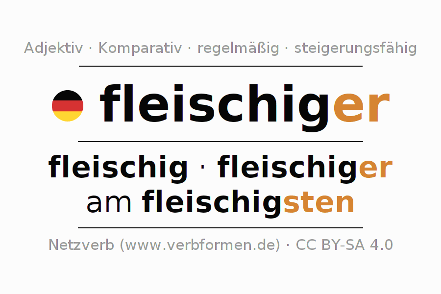 Die Deklination des Adjektivs fleischiger erfolgt über die Komparationsformen fleischig,fleischiger,am fleischigsten. Die Endungen für die Steigerung im Komparativ und Superlativ sind er/sten. Das Adjektiv fleischiger kann sowohl attributiv vor einem Nomen mit und ohne Artikel jeweils stark, schwach und gemischt verwendet werden als auch prädikativ in Verbindung mit einem Verb.Man kann hier nicht nur fleischiger deklinieren und steigern, sondern alle deutschen Adjektive. Kommentare ☆