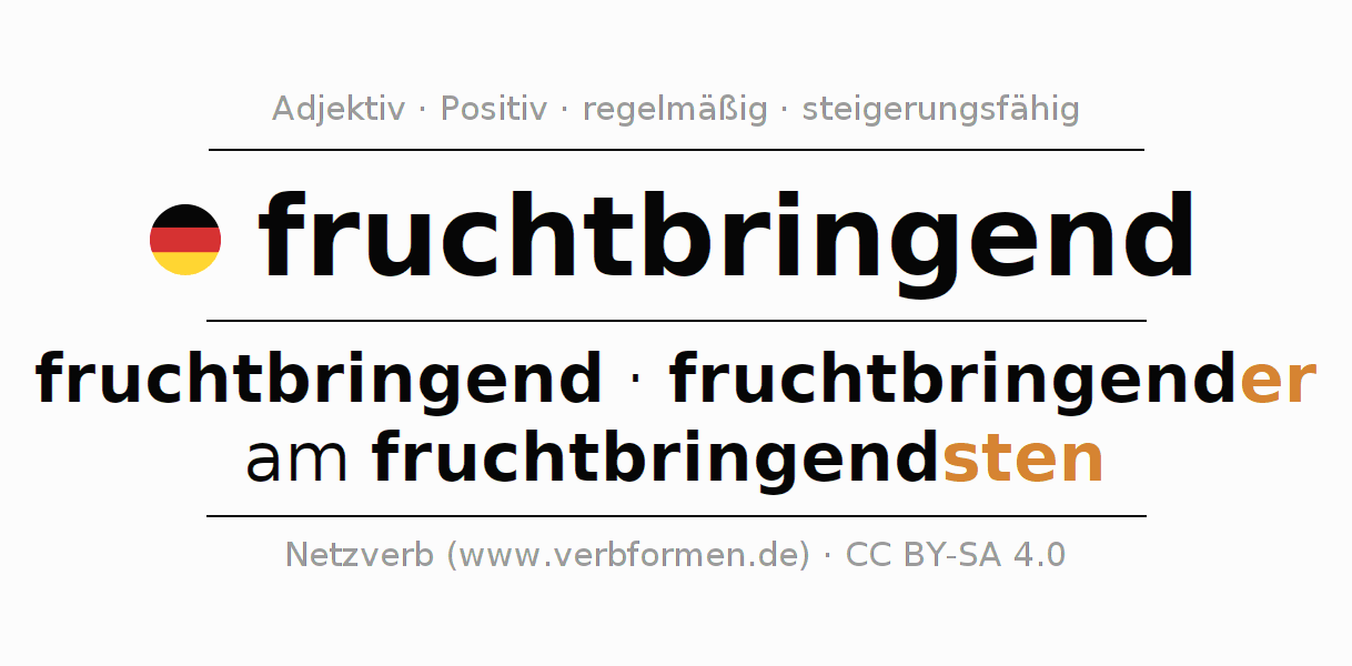 Die Deklination des Adjektivs fruchtbringend erfolgt über die Komparationsformen fruchtbringend,fruchtbringender,am fruchtbringendsten. Die Endungen für die Steigerung im Komparativ und Superlativ sind er/sten. Das Adjektiv fruchtbringend kann sowohl attributiv vor einem Nomen mit und ohne Artikel jeweils stark, schwach und gemischt verwendet werden als auch prädikativ in Verbindung mit einem Verb.Man kann hier nicht nur fruchtbringend deklinieren und steigern, sondern alle deutschen Adjektive. Kommentare ☆