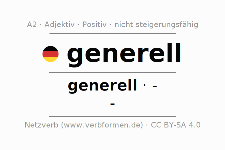 Die generell Deklination und Steigerung online als Deklinations- und Komparationstabellen mit allen starken, schwachen und gemischten Formen. Diese werden übersichtlich als Tabelle im Singular (Einzahl) und im Plural (Mehrzahl) und in allen vier Fällen Nominativ (auch 1. Fall, Wer-Fall), Genitiv (auch 2. Fall, Wes-Fall, Wessen-Fall), Dativ (auch 3. Fall, Wem-Fall) und Akkusativ (auch 4. Fall, Wen-Fall) dargestellt. Weitere Informationen finden sich unter Wiktionary generell und unter generell im Duden.