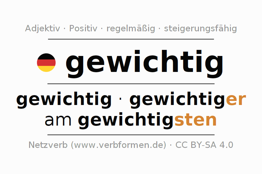 Die Deklination des Adjektivs gewichtig erfolgt über die Komparationsformen gewichtig,gewichtiger,am gewichtigsten. Die Endungen für die Steigerung im Komparativ und Superlativ sind er/sten. Das Adjektiv gewichtig kann sowohl attributiv vor einem Nomen mit und ohne Artikel jeweils stark, schwach und gemischt verwendet werden als auch prädikativ in Verbindung mit einem Verb.Man kann hier nicht nur gewichtig deklinieren und steigern, sondern alle deutschen Adjektive. Kommentare ☆