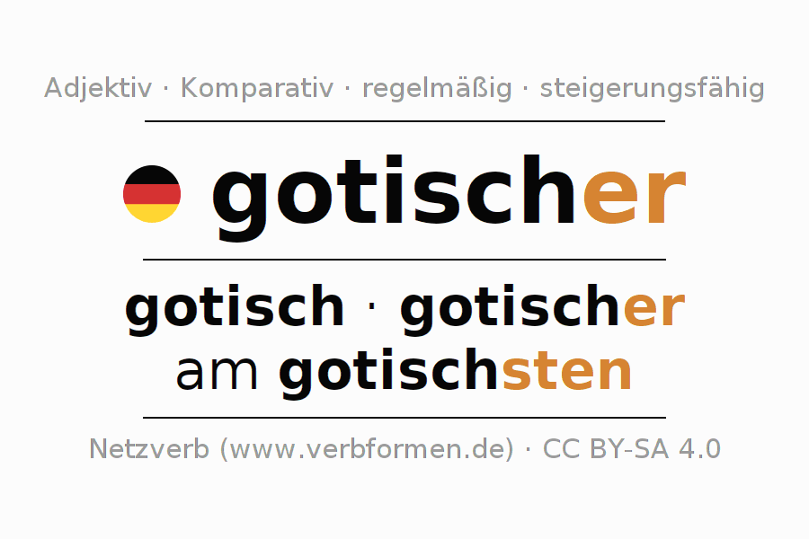 Die Deklination des Adjektivs gotischer erfolgt über die Komparationsformen gotisch,gotischer,am gotischsten. Die Endungen für die Steigerung im Komparativ und Superlativ sind er/sten. Das Adjektiv gotischer kann sowohl attributiv vor einem Nomen mit und ohne Artikel jeweils stark, schwach und gemischt verwendet werden als auch prädikativ in Verbindung mit einem Verb.Man kann hier nicht nur gotischer deklinieren und steigern, sondern alle deutschen Adjektive. Kommentare ☆