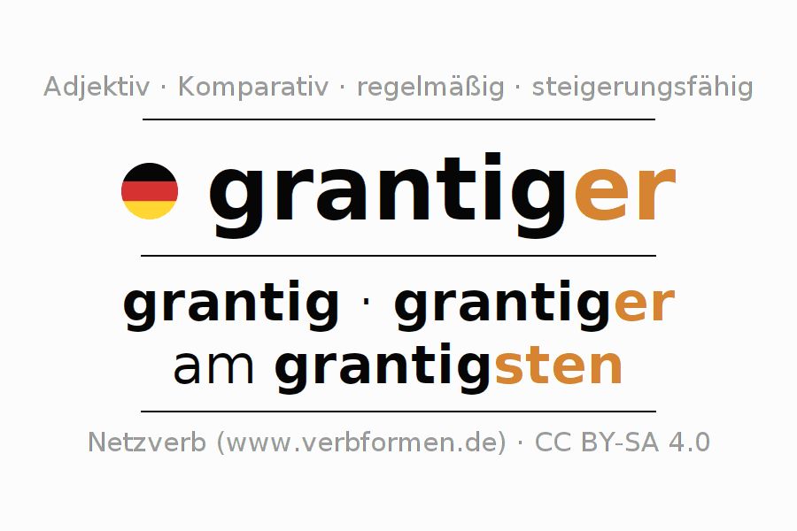 Die grantiger Deklination und Steigerung online als Deklinations- und Komparationstabellen mit allen starken, schwachen und gemischten Formen. Diese werden übersichtlich als Tabelle im Singular (Einzahl) und im Plural (Mehrzahl) und in allen vier Fällen Nominativ (auch 1. Fall, Wer-Fall), Genitiv (auch 2. Fall, Wes-Fall, Wessen-Fall), Dativ (auch 3. Fall, Wem-Fall) und Akkusativ (auch 4. Fall, Wen-Fall) dargestellt. Weitere Informationen finden sich unter Wiktionary grantiger und unter grantiger im Duden.