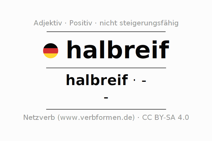Die halbreif Deklination und Steigerung online als Deklinations- und Komparationstabellen mit allen starken, schwachen und gemischten Formen. Diese werden übersichtlich als Tabelle im Singular (Einzahl) und im Plural (Mehrzahl) und in allen vier Fällen Nominativ (auch 1. Fall, Wer-Fall), Genitiv (auch 2. Fall, Wes-Fall, Wessen-Fall), Dativ (auch 3. Fall, Wem-Fall) und Akkusativ (auch 4. Fall, Wen-Fall) dargestellt. Weitere Informationen finden sich unter Wiktionary halbreif und unter halbreif im Duden.