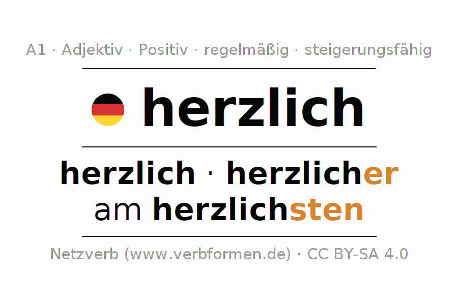 Die Deklination des Adjektivs herzlich erfolgt über die Komparationsformen herzlich,herzlicher,am herzlichsten. Die Endungen für die Steigerung im Komparativ und Superlativ sind er/sten. Das Adjektiv herzlich kann sowohl attributiv vor einem Nomen mit und ohne Artikel jeweils stark, schwach und gemischt verwendet werden als auch prädikativ in Verbindung mit einem Verb.Man kann hier nicht nur herzlich deklinieren und steigern, sondern alle deutschen Adjektive. Kommentare ☆