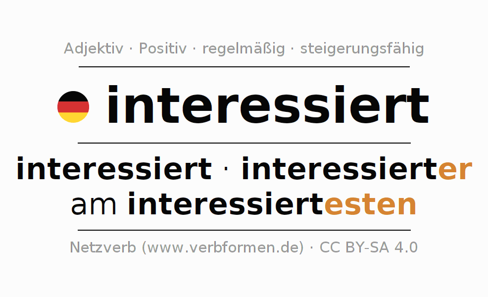 Die Deklination des Adjektivs interessiert erfolgt über die Komparationsformen interessiert,interessierter,am interessiertesten. Die Endungen für die Steigerung im Komparativ und Superlativ sind er/esten. Das Adjektiv interessiert kann sowohl attributiv vor einem Nomen mit und ohne Artikel jeweils stark, schwach und gemischt verwendet werden als auch prädikativ in Verbindung mit einem Verb.Man kann hier nicht nur interessiert deklinieren und steigern, sondern alle deutschen Adjektive. Kommentare ☆