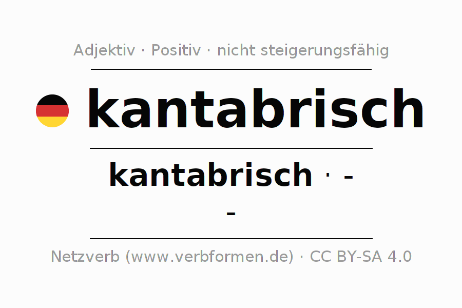 Die Deklination des Adjektivs kantabrisch erfolgt über die nicht steigerbare Form kantabrisch. Das Adjektiv besitzt keine Formen für den Komparativ und Superlativ. Das Adjektiv kantabrisch kann sowohl attributiv vor einem Nomen mit und ohne Artikel jeweils stark, schwach und gemischt verwendet werden als auch prädikativ in Verbindung mit einem Verb.Man kann hier nicht nur kantabrisch deklinieren und steigern, sondern alle deutschen Adjektive. Kommentare ☆