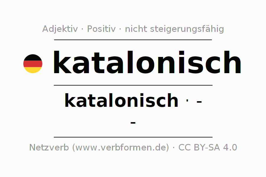 Die Deklination des Adjektivs katalonisch erfolgt über die nicht steigerbare Form katalonisch. Das Adjektiv besitzt keine Formen für den Komparativ und Superlativ. Das Adjektiv katalonisch kann sowohl attributiv vor einem Nomen mit und ohne Artikel jeweils stark, schwach und gemischt verwendet werden als auch prädikativ in Verbindung mit einem Verb.Man kann hier nicht nur katalonisch deklinieren und steigern, sondern alle deutschen Adjektive. Kommentare ☆