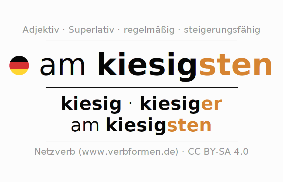 Die am kiesigsten Deklination und Steigerung online als Deklinations- und Komparationstabellen mit allen starken, schwachen und gemischten Formen. Diese werden übersichtlich als Tabelle im Singular (Einzahl) und im Plural (Mehrzahl) und in allen vier Fällen Nominativ (auch 1. Fall, Wer-Fall), Genitiv (auch 2. Fall, Wes-Fall, Wessen-Fall), Dativ (auch 3. Fall, Wem-Fall) und Akkusativ (auch 4. Fall, Wen-Fall) dargestellt. Weitere Informationen finden sich unter Wiktionary am kiesigsten und unter am kiesigsten im Duden.