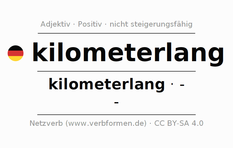 Die kilometerlang Deklination und Steigerung online als Deklinations- und Komparationstabellen mit allen starken, schwachen und gemischten Formen. Diese werden übersichtlich als Tabelle im Singular (Einzahl) und im Plural (Mehrzahl) und in allen vier Fällen Nominativ (auch 1. Fall, Wer-Fall), Genitiv (auch 2. Fall, Wes-Fall, Wessen-Fall), Dativ (auch 3. Fall, Wem-Fall) und Akkusativ (auch 4. Fall, Wen-Fall) dargestellt. Weitere Informationen finden sich unter Wiktionary kilometerlang und unter kilometerlang im Duden.