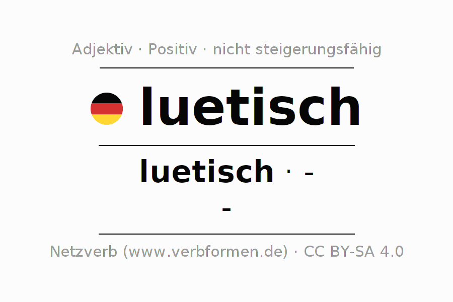 Die Deklination des Adjektivs luetisch erfolgt über die nicht steigerbare Form luetisch. Das Adjektiv besitzt keine Formen für den Komparativ und Superlativ. Das Adjektiv luetisch kann sowohl attributiv vor einem Nomen mit und ohne Artikel jeweils stark, schwach und gemischt verwendet werden als auch prädikativ in Verbindung mit einem Verb.Man kann hier nicht nur luetisch deklinieren und steigern, sondern alle deutschen Adjektive. Kommentare ☆
