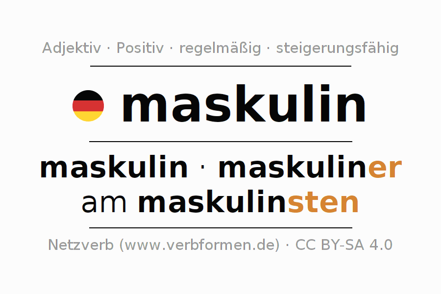 Die Deklination des Adjektivs maskulin erfolgt über die Komparationsformen maskulin,maskuliner,am maskulinsten. Die Endungen für die Steigerung im Komparativ und Superlativ sind er/sten. Das Adjektiv maskulin kann sowohl attributiv vor einem Nomen mit und ohne Artikel jeweils stark, schwach und gemischt verwendet werden als auch prädikativ in Verbindung mit einem Verb.Man kann hier nicht nur maskulin deklinieren und steigern, sondern alle deutschen Adjektive. Kommentare ☆