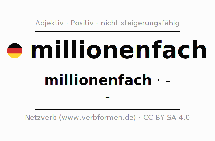 Die millionenfach Deklination und Steigerung online als Deklinations- und Komparationstabellen mit allen starken, schwachen und gemischten Formen. Diese werden übersichtlich als Tabelle im Singular (Einzahl) und im Plural (Mehrzahl) und in allen vier Fällen Nominativ (auch 1. Fall, Wer-Fall), Genitiv (auch 2. Fall, Wes-Fall, Wessen-Fall), Dativ (auch 3. Fall, Wem-Fall) und Akkusativ (auch 4. Fall, Wen-Fall) dargestellt. Weitere Informationen finden sich unter Wiktionary millionenfach und unter millionenfach im Duden.
