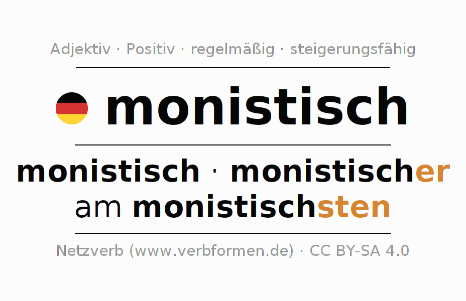 Die monistisch Deklination und Steigerung online als Deklinations- und Komparationstabellen mit allen starken, schwachen und gemischten Formen. Diese werden übersichtlich als Tabelle im Singular (Einzahl) und im Plural (Mehrzahl) und in allen vier Fällen Nominativ (auch 1. Fall, Wer-Fall), Genitiv (auch 2. Fall, Wes-Fall, Wessen-Fall), Dativ (auch 3. Fall, Wem-Fall) und Akkusativ (auch 4. Fall, Wen-Fall) dargestellt. Weitere Informationen finden sich unter Wiktionary monistisch und unter monistisch im Duden.