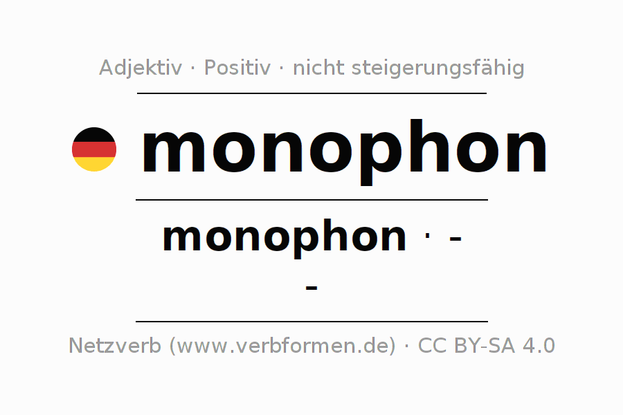 Die Deklination des Adjektivs monophon erfolgt über die nicht steigerbare Form monophon. Das Adjektiv besitzt keine Formen für den Komparativ und Superlativ. Das Adjektiv monophon kann sowohl attributiv vor einem Nomen mit und ohne Artikel jeweils stark, schwach und gemischt verwendet werden als auch prädikativ in Verbindung mit einem Verb.Man kann hier nicht nur monophon deklinieren und steigern, sondern alle deutschen Adjektive. Kommentare ☆