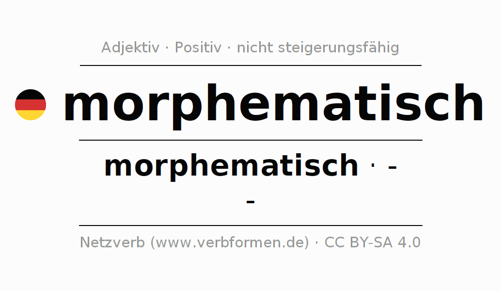 Die morphematisch Deklination und Steigerung online als Deklinations- und Komparationstabellen mit allen starken, schwachen und gemischten Formen. Diese werden übersichtlich als Tabelle im Singular (Einzahl) und im Plural (Mehrzahl) und in allen vier Fällen Nominativ (auch 1. Fall, Wer-Fall), Genitiv (auch 2. Fall, Wes-Fall, Wessen-Fall), Dativ (auch 3. Fall, Wem-Fall) und Akkusativ (auch 4. Fall, Wen-Fall) dargestellt. Weitere Informationen finden sich unter Wiktionary morphematisch und unter morphematisch im Duden.
