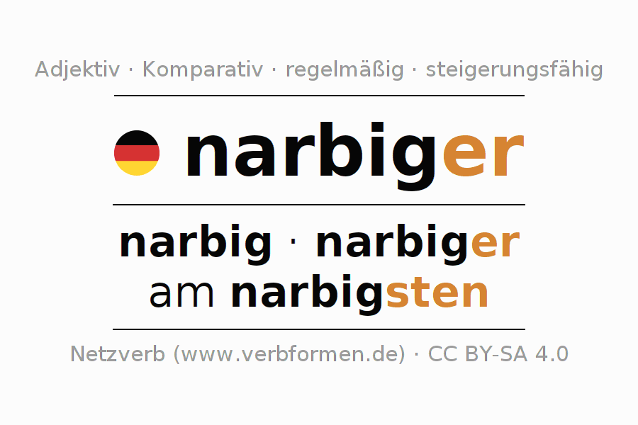 Die Deklination des Adjektivs narbiger erfolgt über die Komparationsformen narbig,narbiger,am narbigsten. Die Endungen für die Steigerung im Komparativ und Superlativ sind er/sten. Das Adjektiv narbiger kann sowohl attributiv vor einem Nomen mit und ohne Artikel jeweils stark, schwach und gemischt verwendet werden als auch prädikativ in Verbindung mit einem Verb.Man kann hier nicht nur narbiger deklinieren und steigern, sondern alle deutschen Adjektive. Kommentare ☆