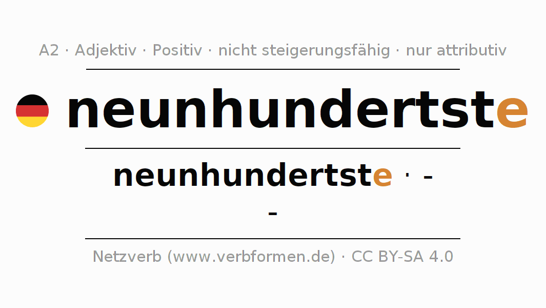 Die neunhundertste Deklination und Steigerung online als Deklinations- und Komparationstabellen mit allen starken, schwachen und gemischten Formen. Diese werden übersichtlich als Tabelle im Singular (Einzahl) und im Plural (Mehrzahl) und in allen vier Fällen Nominativ (auch 1. Fall, Wer-Fall), Genitiv (auch 2. Fall, Wes-Fall, Wessen-Fall), Dativ (auch 3. Fall, Wem-Fall) und Akkusativ (auch 4. Fall, Wen-Fall) dargestellt. Weitere Informationen finden sich unter Wiktionary neunhundertste und unter neunhundertste im Duden.