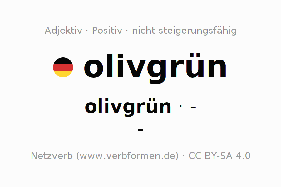 Die Deklination des Adjektivs olivgrün erfolgt über die nicht steigerbare Form olivgrün. Das Adjektiv besitzt keine Formen für den Komparativ und Superlativ. Das Adjektiv olivgrün kann sowohl attributiv vor einem Nomen mit und ohne Artikel jeweils stark, schwach und gemischt verwendet werden als auch prädikativ in Verbindung mit einem Verb.Man kann hier nicht nur olivgrün deklinieren und steigern, sondern alle deutschen Adjektive. Kommentare ☆