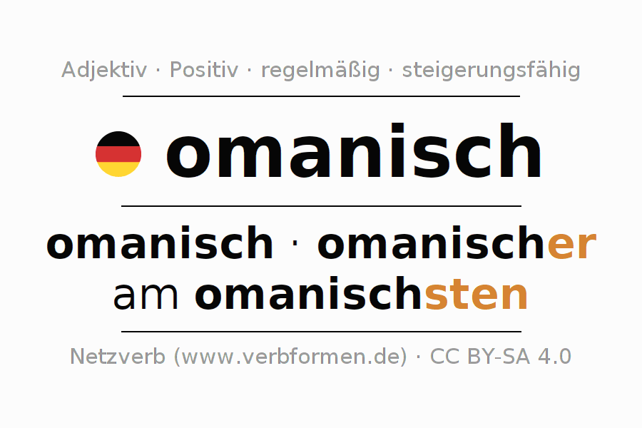 Die Deklination des Adjektivs omanisch erfolgt über die Komparationsformen omanisch,omanischer,am omanischsten. Die Endungen für die Steigerung im Komparativ und Superlativ sind er/sten. Das Adjektiv omanisch kann sowohl attributiv vor einem Nomen mit und ohne Artikel jeweils stark, schwach und gemischt verwendet werden als auch prädikativ in Verbindung mit einem Verb.Man kann hier nicht nur omanisch deklinieren und steigern, sondern alle deutschen Adjektive. Kommentare ☆