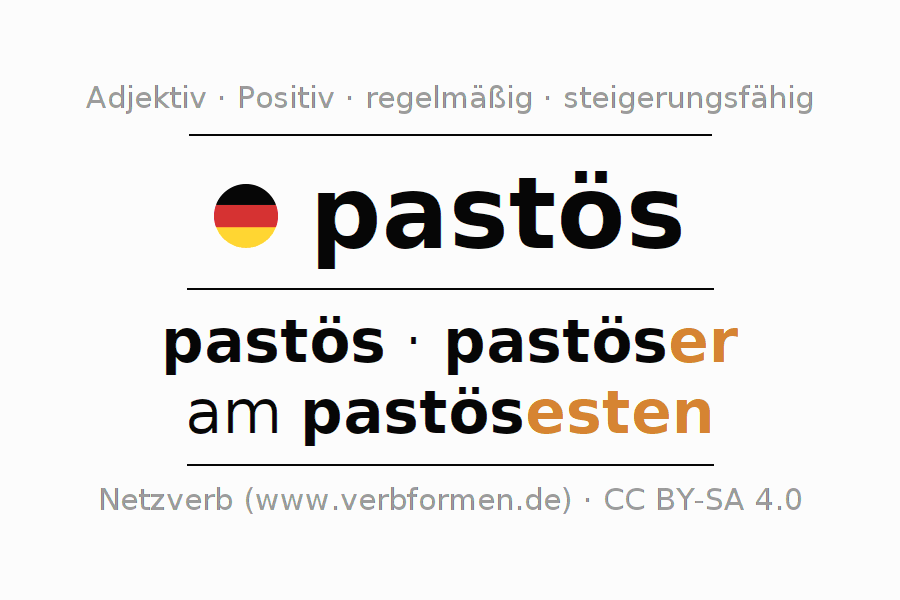 Die Deklination des Adjektivs pastös erfolgt über die Komparationsformen pastös,pastöser,am pastösesten. Die Endungen für die Steigerung im Komparativ und Superlativ sind er/esten. Das Adjektiv pastös kann sowohl attributiv vor einem Nomen mit und ohne Artikel jeweils stark, schwach und gemischt verwendet werden als auch prädikativ in Verbindung mit einem Verb.Man kann hier nicht nur pastös deklinieren und steigern, sondern alle deutschen Adjektive. Kommentare ☆