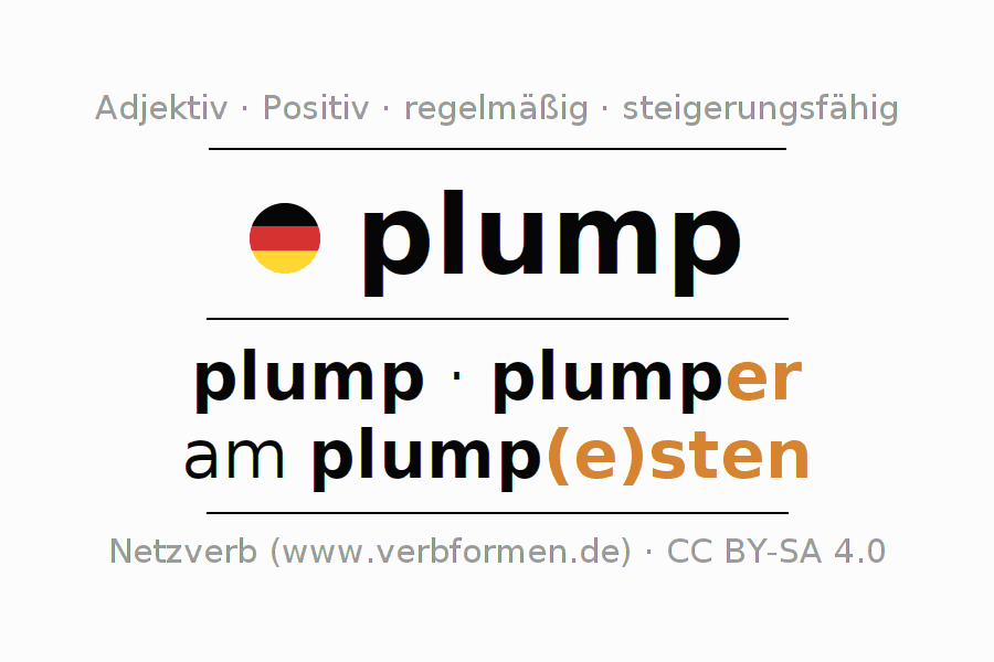 Die Deklination des Adjektivs plump erfolgt über die Komparationsformen plump,plumper,am plumpsten. Die Endungen für die Steigerung im Komparativ und Superlativ sind er/sten. Das Adjektiv plump kann sowohl attributiv vor einem Nomen mit und ohne Artikel jeweils stark, schwach und gemischt verwendet werden als auch prädikativ in Verbindung mit einem Verb.Man kann hier nicht nur plump deklinieren und steigern, sondern alle deutschen Adjektive. Kommentare ☆